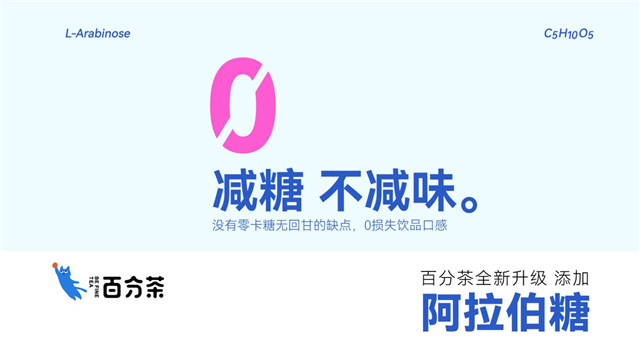 很多研究表明,人对甜味的依赖性几乎是难以撼动的。如何既保持人们习以为常的蔗糖口感,又能保证低卡轻负担,同时能稳定血糖水平,也成了包括新式茶饮在内的食品行业的一大困扰。基于此,市场上很多茶饮品牌都做了产品优化,如喜茶增加零卡糖甜菊糖、乐乐茶增加零卡糖赤藓糖醇、SEVENBUS全线使用零卡糖等。百分茶作为新式茶饮代表品牌之一,其主打产品线水果茶也在不断探求市场客观规律。在五周年之际,宣布全线升级添加具备抑糖控糖功效的阿拉伯糖。
