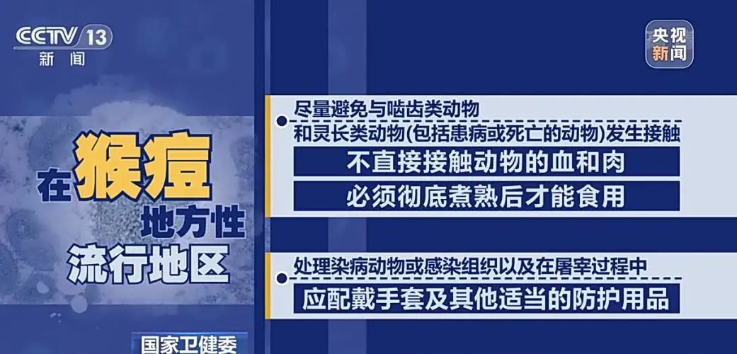 图片来源:央视新闻指南对猴痘目前的疫情概况,疾病特点,诊断等做了介绍。指南从预防角度指出,出入境人员和涉疫地区人员需关注所在国的猴痘疫情信息。在猴痘地方性流行地区,尽量避免与啮齿类动物和灵长类动物(包括患病或死亡的动物)发生接触,不直接接触动物的血和肉,必须彻底煮熟后才能食用。处理染病动物或感染组织以及在屠宰过程中,应佩戴手套及其他适当的防护用品。疫区归国人员需注意自我健康监测,出现皮疹等症状时,应主动就医,并告知接诊医生疫区旅行史,以助于诊断和治疗。若在国外有过接触史和暴露史,尚未出现症状,可主动联系当地疾控中心进行咨询和报备。指南指出,各级各类医疗卫生机构日常接诊发热伴出疹病人时,应注意询问病例流行病学史,同时进行病原学筛查,排除水痘、风疹、麻疹或其他明确病因引起。现有入境人员隔离期间,在排查新冠病毒感染的同时,各地应主动对入境人员进行猴痘病毒排查,特别是入境前21天内有猴痘疫情报告国旅居史的人员,密切监测出疹情况,发现可疑人员或疑似病例,应按相关规定及时报告辖区疾控机构并转送定点收治医疗机构。猴痘是由猴痘病毒感染所致的一种人兽共患病,临床表现主要为发热、皮疹、淋巴结肿大,通常为自限性疾病,但部分患者可出现并发症,包括皮损部位继发细菌感染、脑炎等。本轮疫情症状轻,皮疹数量少且不典型。猴痘主要通过接触感染动物的呼吸道分泌物、病变渗出物、血液、其他体液,或被感染动物咬伤、抓伤而感染。人与人之间主要通过密切接触传播,亦可在长时间近距离接触时通过飞沫传播,接触病毒污染的物品也有可能感染。病毒还可通过胎盘从孕妇传播给胎儿。2022年5月以来,发生在非流行国家的猴痘疫情以男男同性性行为人群为主(约占96%),以性接触为主要传播方式。自1970年在刚果(金)确诊首例人猴痘病例以来,猴痘疫情主要发生在中非和西非国家。非洲以外国家猴痘疫情较少,均由非洲国家(动物或人)输入所致,本地传播有限。2022年5月以来,猴痘首次在欧洲、美洲等既往非流行国家发生持续传播,截至9月14日,全球103个国家/地区共报告猴痘确诊病例59147例。截至目前,我国台湾省报告3例病例、香港特别行政区报告1例病例,内地报告1例病例,均为境外输入病例。猴痘为自限性疾病,大部分预后良好。目前国内尚无特异性抗猴痘病毒药物。治疗主要是对症支持治疗和并发症治疗。大多数情况下,猴痘症状在2-4周内自行消失,但对免疫缺陷者等特殊人群,可能会导致临床并发症,甚至死亡。目前我国没有专门的猴痘疫苗,但接种天花疫苗对预防猴痘可起到85%的免疫保护效果。目前,因猴痘对普通人群感染风险低,所以世界卫生组织目前不建议大规模接种猴痘疫苗。需关注所在国猴痘疫情信息。尽量避免与当地啮齿类动物和灵长类动物(包括患病或死亡的动物)发生接触,不直接接触动物的体液、分泌物、血液等,肉类必须彻底煮熟后才能食用。处理染病动物或感染组织以及在屠宰过程中,应配戴手套及其他适当的防护用品。同时加强个人手卫生。如果必须接触猴痘病人,应避免身体密切接触,避免与可疑感染者发生性行为,避免共用生活用品(如床上用品、衣物等),照看或探视病人时要做好个人防护(如佩戴一次性乳胶手套、医用防护口罩、一次性隔离衣等)。注意做好手部卫生,及时用肥皂、洗手液等在流动水下洗手。疫区归国人员入境21天内应主动开展自我健康监测,若在国外有可疑动物、人员或猴痘病例接触史,应主动联系当地疾控机构进行咨询和报备。若出现发热、皮疹等症状,应主动就医,并告知接诊医生境外旅居史和接触史,以协助诊断和治疗。即将回国人员除注意上述事项外,入境健康申报时需配合海关主动报备。需密切关注目的地国家猴痘疫情,了解掌握猴痘预防相关知识,如避免接触啮齿类动物和猴痘病人,避免与病人共用物品,避免与可疑感染者发生性行为,做好个人手卫生,一旦出现不明原因皮疹等猴痘相关症状须及时就医。