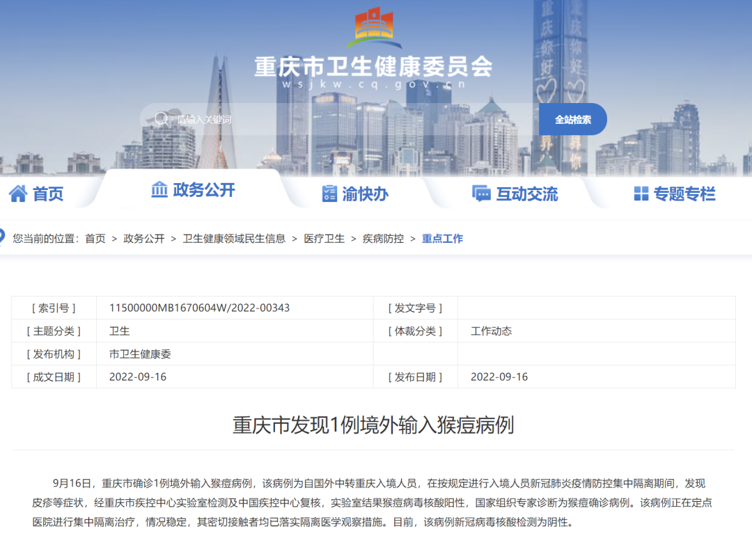 据重庆市卫健委网站,9月16日,重庆市确诊1例境外输入猴痘病例,该病例为自国外中转重庆入境人员,在按规定进行入境人员新冠肺炎疫情防控集中隔离期间,发现皮疹等症状,经重庆市疾控中心实验室检测及中国疾控中心复核,实验室结果猴痘病毒核酸阳性,国家组织专家诊断为猴痘确诊病例。该病例正在定点医院进行集中隔离治疗,情况稳定,其密切接触者均已落实隔离医学观察措施。目前,该病例新冠病毒核酸检测为阴性。