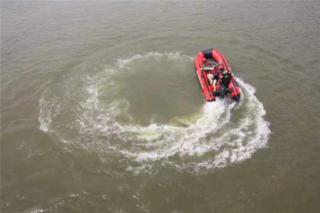 接到命令后,三艘冲锋舟迅疾驶向溺水人员,两艘冲锋舟在两侧接应,一艘冲锋舟缓慢接近溺水者,只见操舟手迅速调转操舟机方向,另外一名民兵熟练利用“离心力救援法”将溺水者迅速拉至船中,迅速向岸边驶去,整个救援过程行云流水,一气呵成。