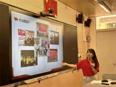 培训内容包括宣讲技巧培训、实践演练、感悟分享等环节。实践团成员廖绮云通过生动有趣的演讲教练,教导学生们如何准备演讲、控制舞台表现以及与听众互动,与此同时,还重点讲述了少先队员应如何讲好一篇爱国故事。学生们在课堂上十分活跃,积极参与到实践演练中,互相观摩、学习、反馈,不断优化自己的演讲表现。课后,学生们纷纷表示愿意参与到爱国宣讲活动之中,向社会传递爱国热情和时代声音。