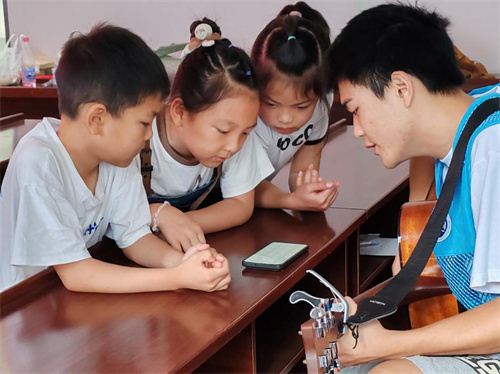 在课余时间,团队成员刘勇弹奏着吉他,低吟浅唱,吸引一众小朋友围坐其旁,细细聆听。从孩子们清澈的眼眸中,刘勇看到了他们对音乐的好奇和向往,“如果他们能因此埋下一颗音乐的种子,主动学习一门乐器,我将感到无比幸运。”
