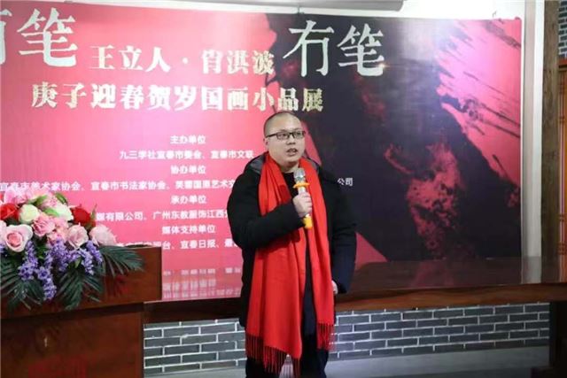 宜春市书法家协会欧阳荷庚主席在致辞中以“有为、有恒、有情”来高度评价肖洪波院长。的确,肖洪波院长不仅是一位有浓浓文化情怀的人,他致力于宜春文化的宣传,以书画院为平台,广邀全国名家进行艺术交流,成功的举办了一系列大型展览,对宣传宜春作出了重要贡献。他还是指掌画家,几十年来的研习使他在指掌画艺术上获得了较高的成就。欧阳荷庚主席又用“不装、不俗、不孤”来盛赞王立人老师有大师水平却无大师做派;格调高雅却平易近人 的艺术情操和品格风范。
