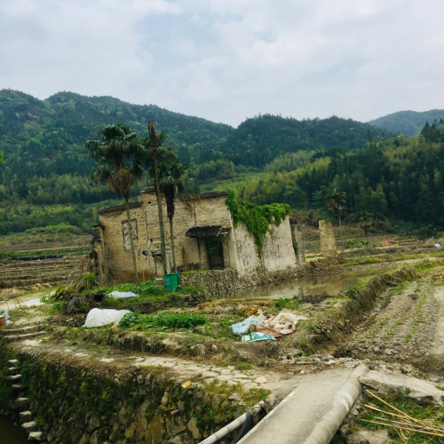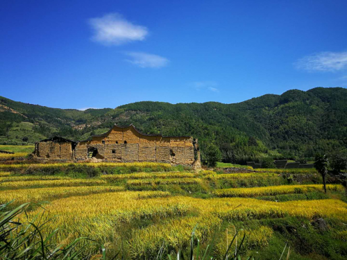 石坑村是陆地的老家,那里有他童年成长的记忆。既然来到了古田,雨山希望去看看,陆地欣然。不去不知道,一去吓一跳,石坑村居然这么美。错落有致的土垒墙古民居,座落在群山环抱之中,村口的参天山枣树在桥边招手,半坡的古香樟遮天敝日、水蜜桃果园紧挨身傍、两条溪流穿村而过,水流声伴着小鸟奏鸣悦耳,水鸭在水中悠游,岸边的柿子已经掛果,远处的梯田盘旋着,虽是秋收之后,但宛若中看到金色的稻浪在翻腾。村民很少,不见青壮年,偶见老弱妇孺守护在家。土垒墻中木结构房屋很多坍塌,落败不堪。只有“墙坚强”哭诉着屹立不倒……。