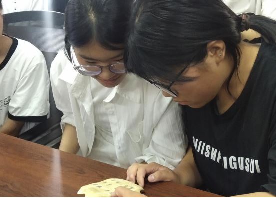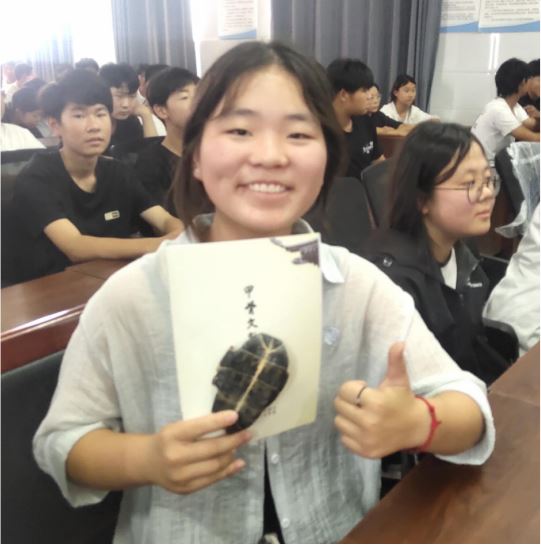 正式授课时,陈老师手持甲骨文图册,生动的讲解让抽象的甲骨文字瞬间鲜活起来。在讲解 "龙" 字时,陈老师邀请对神话故事感兴趣的张昊同学上台,鼓励她结合传说讲解自己对甲骨文中 "龙" 的理解。小张自信地走上讲台,从龙的九种动物特征说起,将甲骨文字形与神话意象巧妙结合,赢得满堂喝彩。陈老师随即赠予她一本甲骨文拓印手册,称赞道:"思维太有创意了!希望你继续探索汉字的奥秘!"