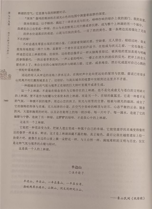 《宁波市志》作为记录地方历史与文化的重要文献,历来以选文严谨、注重文学价值与地域特色著称。俞强的散文《上林湖之绿》以细腻笔触描绘了上林湖的自然风光与人文底蕴,文字清新隽永,意境深远;诗歌《杭州湾大桥组歌》则聚焦现代工程与时代精神,以诗意的语言礼赞了这一跨越天堑的壮丽奇迹。两篇作品风格各异、主题鲜明,共同展现了宁波深厚的文化积淀与生动的时代风貌。