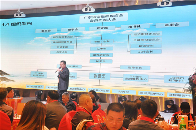 图:广东省安徽蚌埠商会执行会长兼秘书长李振清在会上作了