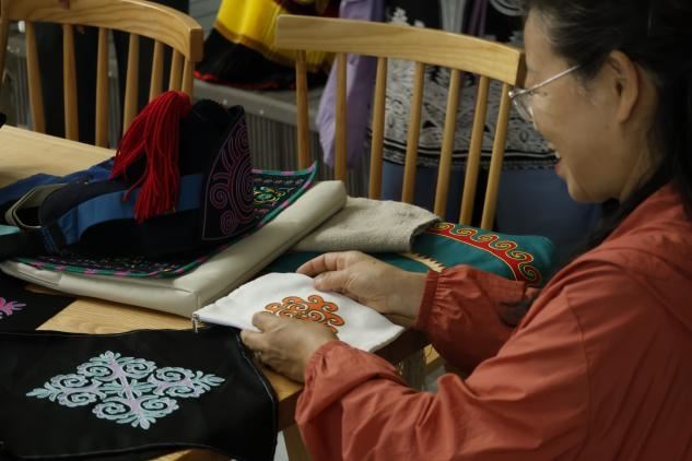紧接着,团队前往越西县彝族文创基地调研。集彝族服饰设计、研发、生产、销售于一体的文创基地,融合传统元素与现代设计理念,推出众多受市场欢迎的产品。基地工作人员阿侯拉则向队员展示彝族服饰文化元素,介绍如何将其运用到现代设计中。队员们认真学习交流,对彝族服饰文化元素有了更全面认识,也为彝绣创新发展提供新思路。