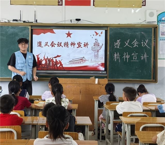 此外,为让青少年快速理解“遵义会议精神”,团队成员“业恒”设置趣味问答环节,围绕会议时间、精神内涵等核心问题与学生互动。“1935年!”“是坚定信念、团结统一!”孩子们的抢答声此起彼伏,在问答中加深了对历史细节和精神内核的记忆。