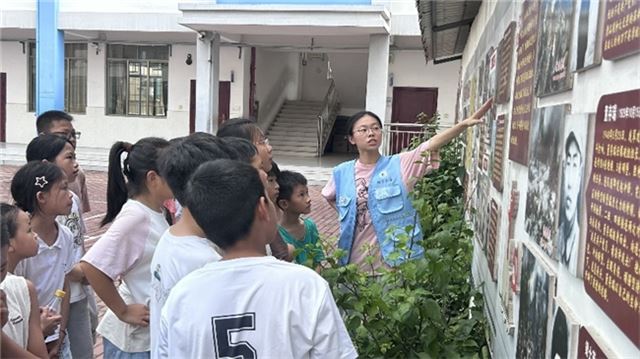 图为团队成员借助学校红色文化进行实践宣讲。任馨懿供图