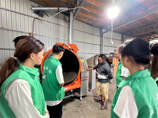 然后队员们来到章外老树茶厂的生产车间。在炒茶区,智能炒茶机有序运转,滚筒均匀受热并自动翻炒,取代了传统手工炒茶时茶农守在铁锅旁,凭借经验调控火候、不停翻炒的繁重工作。在晾晒环节,智能控温、控湿的烘干设备整齐排列,精准模拟出适宜的晾晒环境,告别了过去依赖天气、靠日光晾晒和人工频繁翻拣的方式。在压茶工序中,全自动压茶机高效作业,稳定压制出形状规整的茶饼,无需人工捶打和按压。